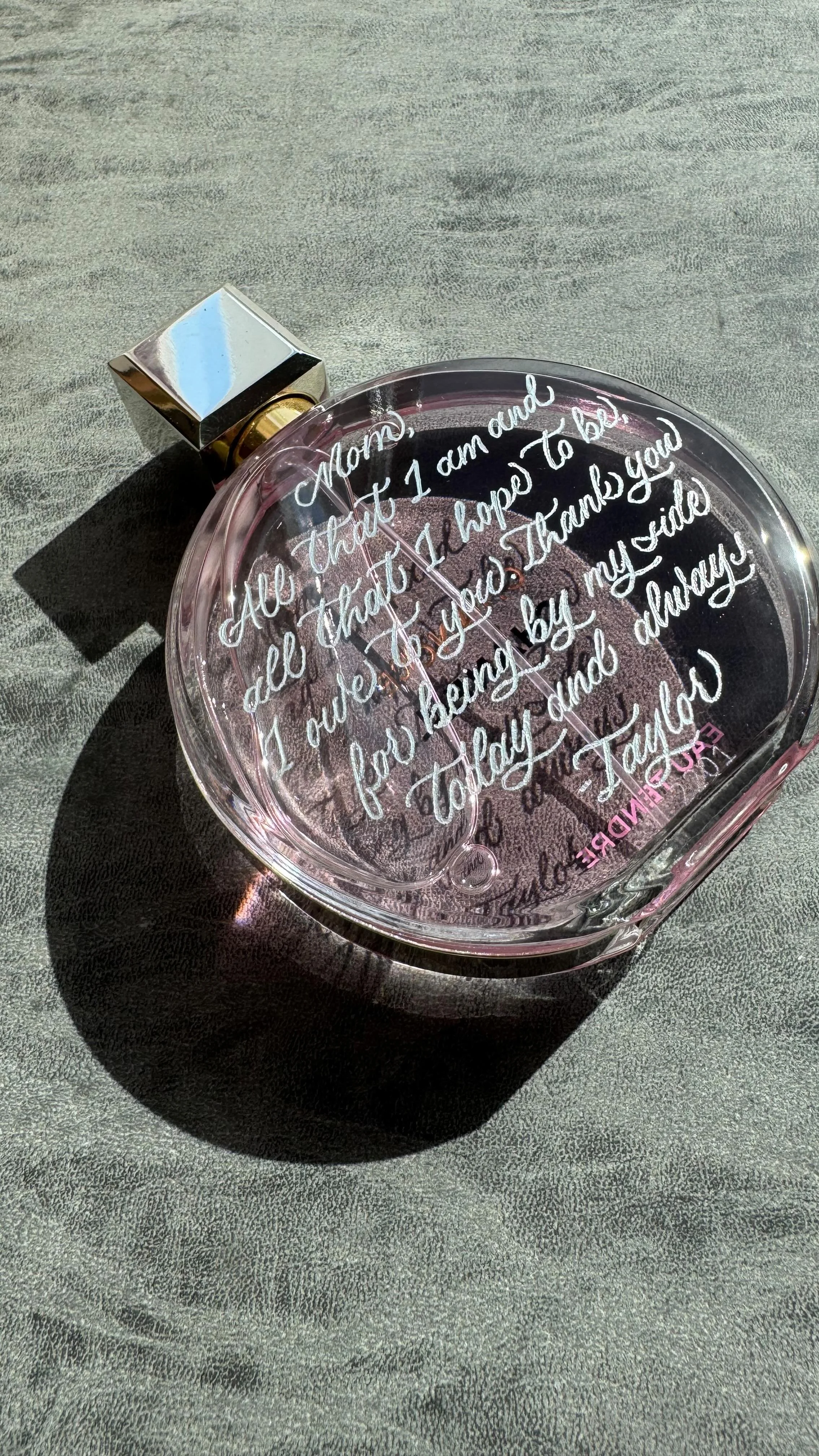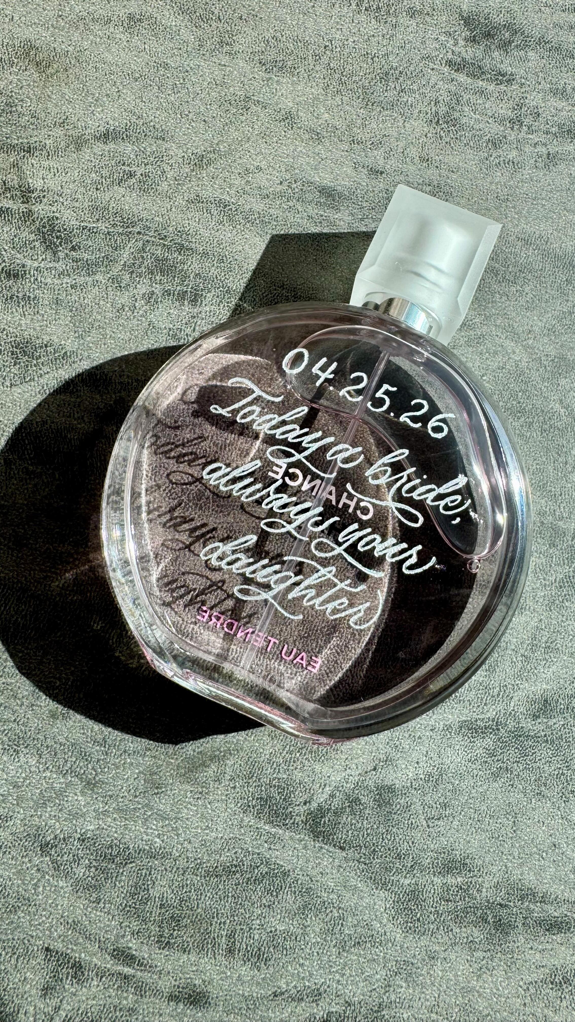 Hand lettered signage rentals, place cards, engraved perfume, painted champagne & more.